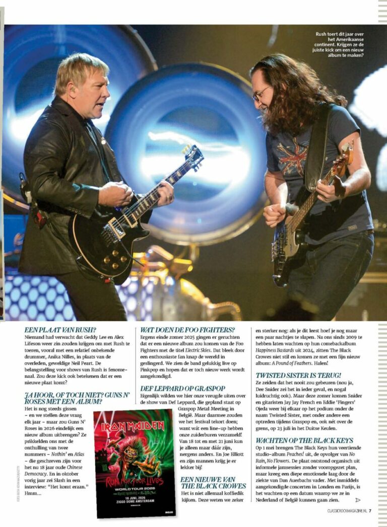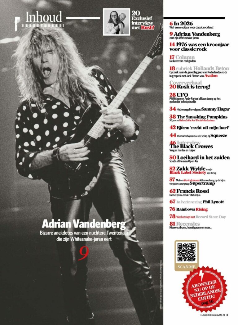 Classic Rock Magazine editie 4 mag je niet missen! Want Rush is terug, en we hebben een exclusief interview met Geddy Lee en Alex Lifeson. Met hun nieuwe drummer Anika Nilles zit er weer volop energie in de rockband. Bovendien, ze hebben inmiddels hun Europese tournee aangekondigd en komen in februari 2027 naar Amsterdam! Met Adrian Vandenberg praten we over zijn tijd bij Whitesnake en met de broers Robinson van The Black Crowes hebben we het over hun nieuwe album. Verder is er volop aandacht voor de hardere muziek: Zakk Wylde heeft weer tijd gevonden voor zijn Black Label Society en met Billie Corgan van The Samshing Pumpkins blikken we terug naar het maken van hun album Mellon Collie And The Infinite Sadness. Ontdek Nederlandse hardrockgeschiedenis met Avalon. Let op: dit magazine is een pre-sale item. Bestellingen worden verzonden vanaf 6 maart 2026, zodat je het vanaf 10 maart bij je thuis kunt verwachten.