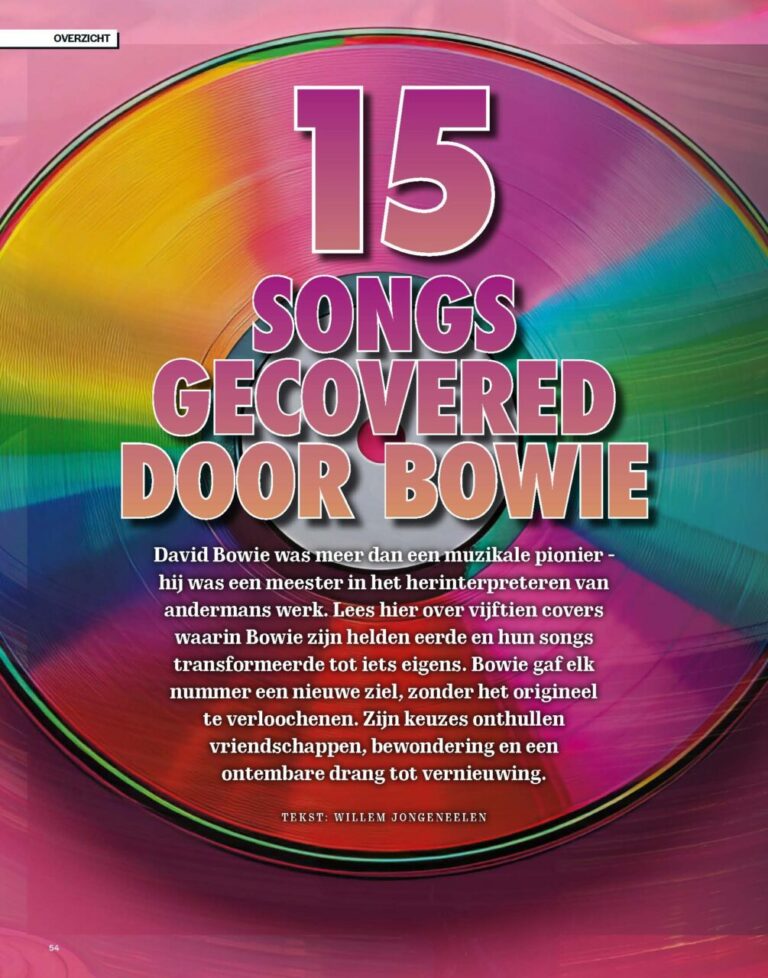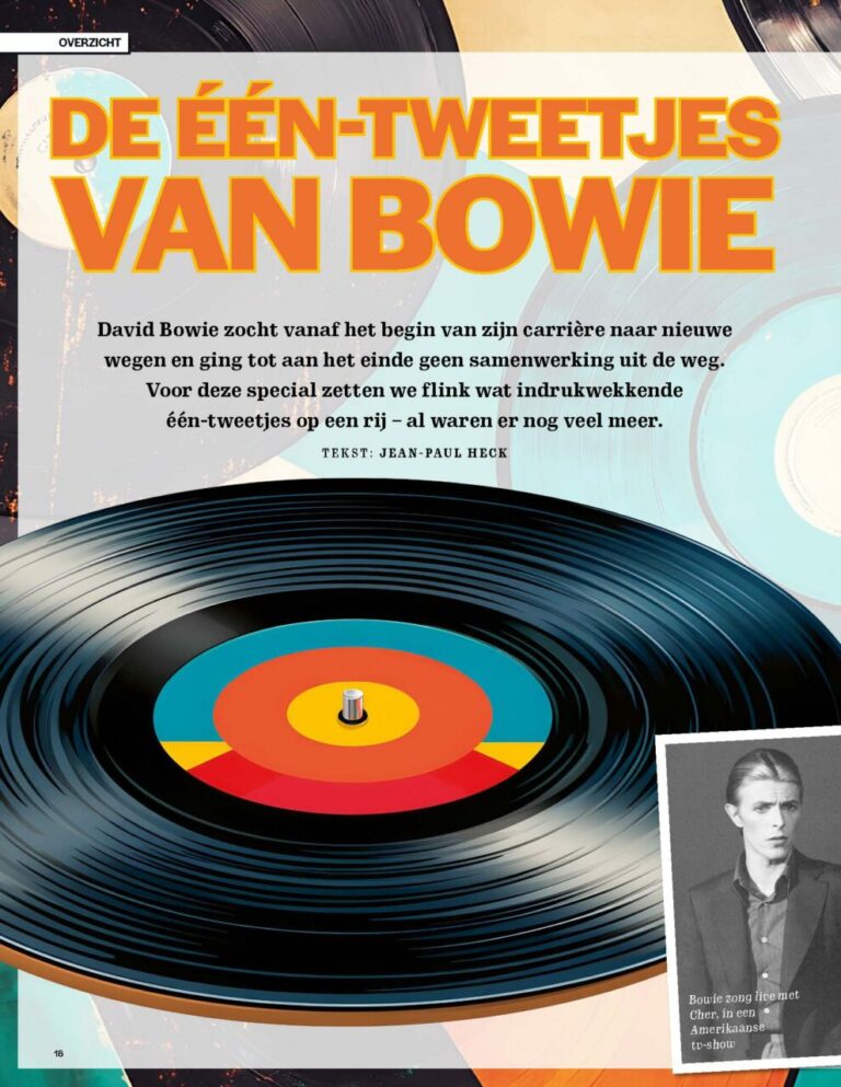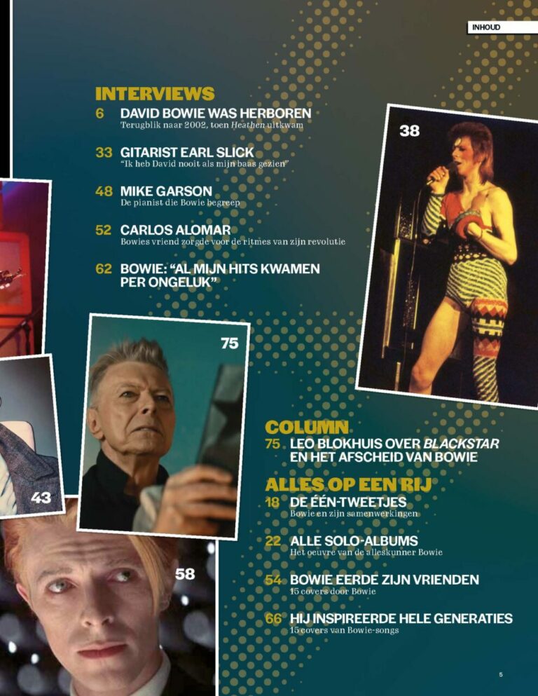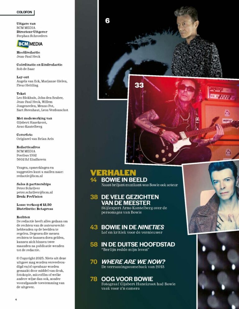Deze exclusieve Nederlandse special neemt je mee door het leven, de muziek en de nalatenschap van een van de grootste iconen ooit: David Bowie. Bowie is al bijna tien jaar niet meer onder ons, maar zijn invloed bestaat nog steeds. Van zijn baanbrekende albums en legendarische Berlijnse periode tot zijn verrassende comeback en emotionele afscheid: alles komt voorbij in deze special. Geniet van unieke interviews met Bowie en zijn bandleden, verhalen over zijn creatieve processen, én schitterende fotografie die zijn vele gezichten toont. Stijlexpert Arno Kantelberg belicht Bowies iconische personages, terwijl Leo Blokhuis zijn laatste meesterwerk Blackstar duidt. Plus: een compleet overzicht van alle albums, covers en samenwerkingen. Dit magazine is een must-have voor iedere muziekliefhebber en verzamelaar. Vier het leven van de man die popmuziek voorgoed veranderde.